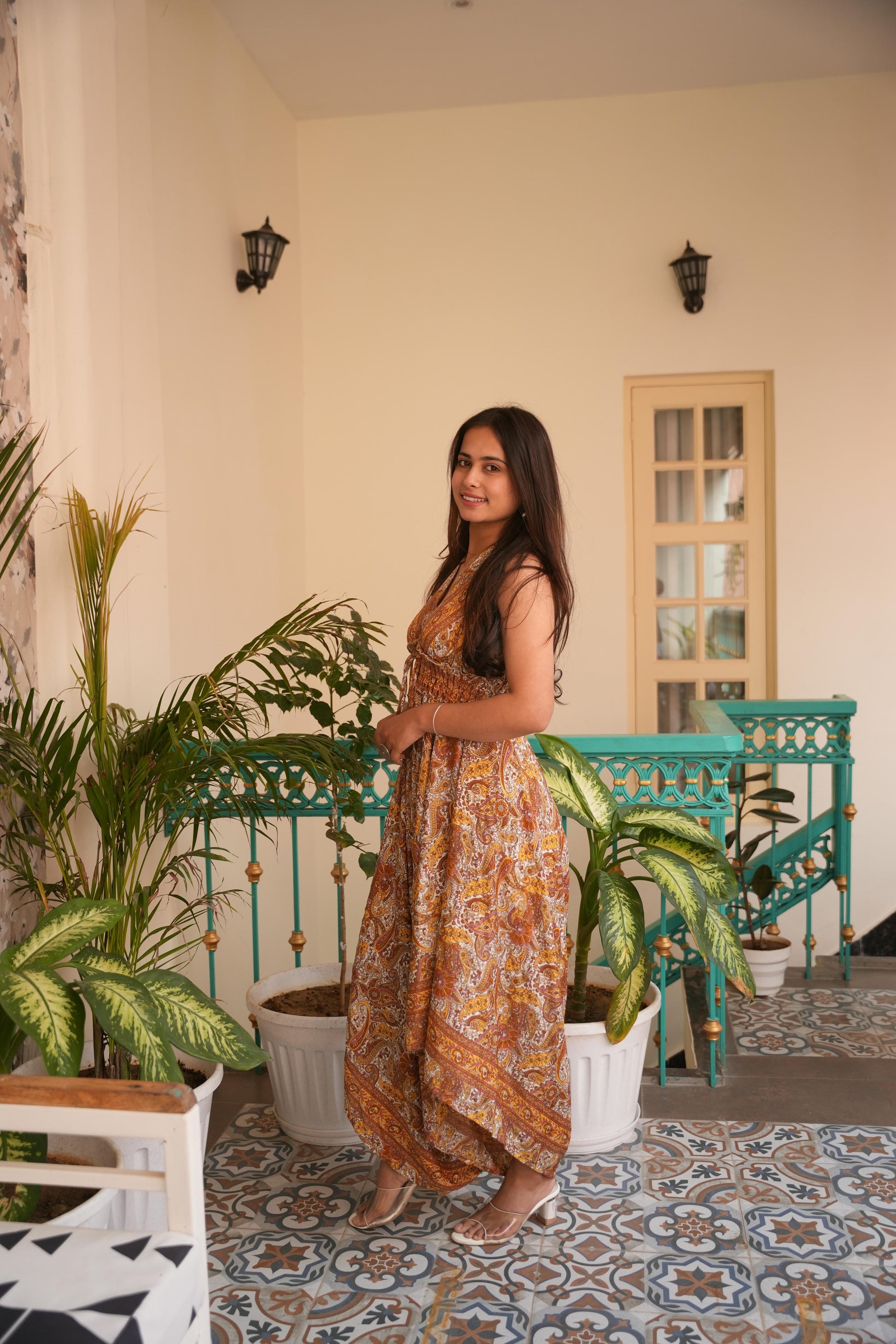 Freya jungleebille boho yellow gold pejali back less long jumpsuit