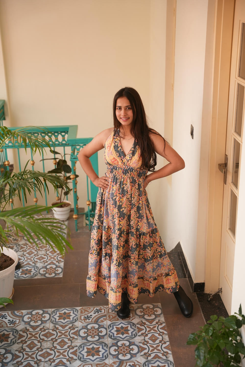 LENON JUNGLLEBILLE BLK-ORANGE GOLD SHADED DOUBEL FRILL BOHO LONG MAXI